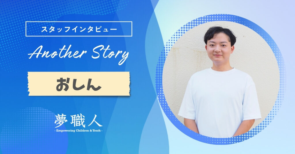 スタッフは、先生や親とは異なる立場から子ども達と関わり、親しいお兄さん・お姉さんのような存在です。「another story」では、そんなスタッフたちが活動をはじめた経緯や活動で感じたことなど、スタッフの一人ひとりの物語をお伝えします。
