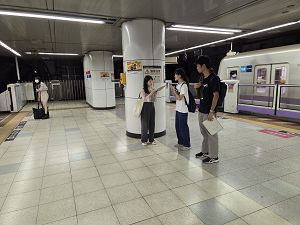 本番に向けて実地踏査では、交通経路や施設内の安全確認、プログラムの流れや内容の検討を行います。まず、施設の最寄り駅まで、安全かつスムーズな移動が行えるように、各駅での移動経路や危険箇所の確認を行いました。