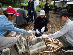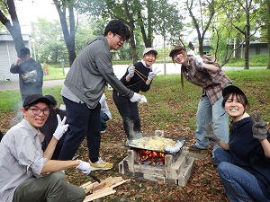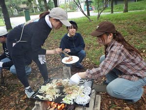 今回のプログラムでは、まず班対抗のレクリエーションを行い、バーベキューに必要な食材や調味料を集めます。お昼は薪を組むところから協力して行い、班ごとに集めた食材でバーベキューを楽しみます。