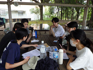 午後はいよいよお待ちかねのバーベキュー!まずは、薪を組んで火の準備をします。火がついたら、各班で獲得した食材を焼いていきます。シンプルに食材を焼くだけでなく、食材同士や調味料との組み合わせでどのようなアレンジ料理ができるのかを試したり、アルミホイルを使って調理方法を工夫したりと、様々な視点でバーベキューをより楽しくする要素を確認していきました。