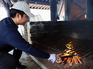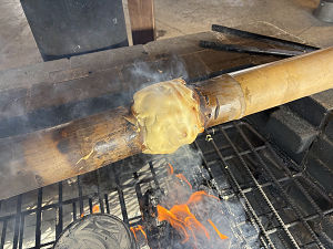 午後は、バームクーヘン作りとクライミング活動の二つに分かれて行いました。バームクーヘン作りでは、竹にアルミホイルを巻き、生地を少しずつ重ねながら焼きました。生地の重さでうまく巻きつかない場面もありましたが、牛乳の量を調整することで生地のかたさを工夫し、モチモチとフワフワのバームクーヘンを作ることができました。