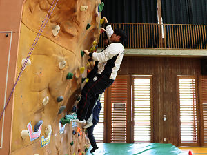 クライミング活動では、指導に関わるための講習を受けました。ヘルメットや安全装置の付け方、器具の正しい扱い方を学び、その後、実際に高さの異なる壁を登りました。特に高い方の壁は難しく感じましたが、子どもたちにとって挑戦しがいのあるアクティビティだと感じました。